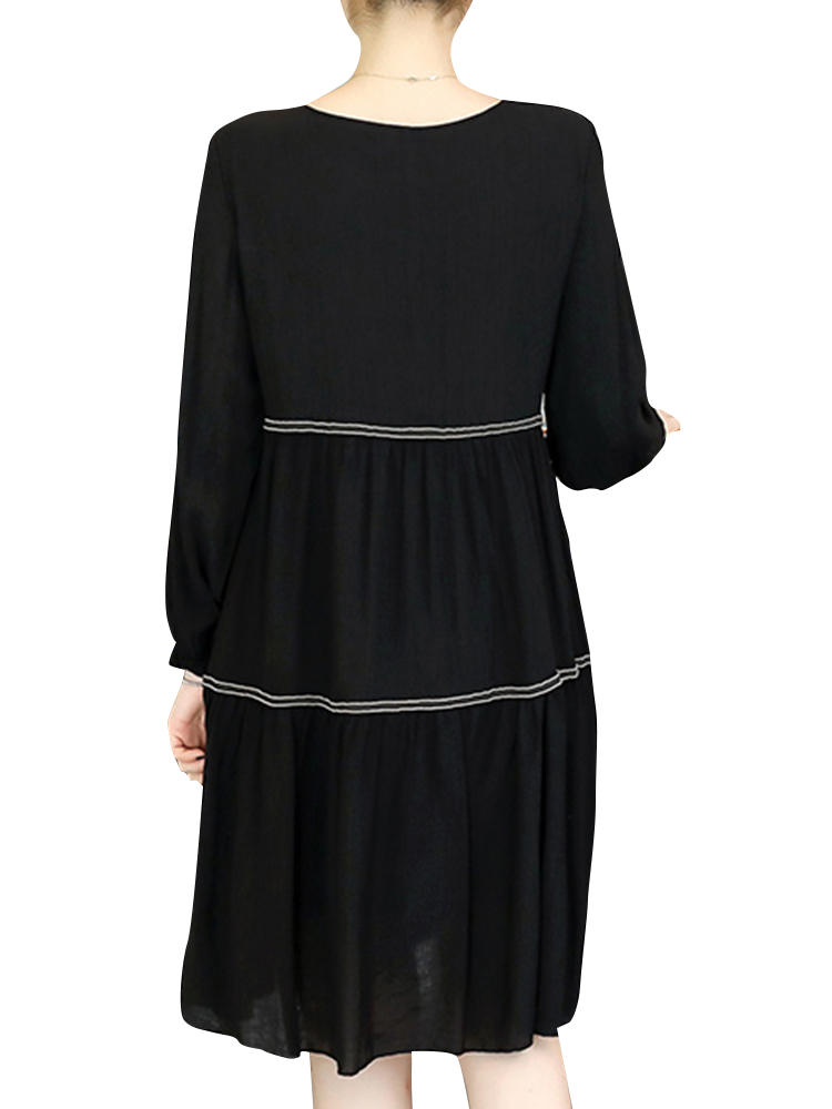 Casual Women Lantern Sleeve O-Neck Pure Color Pleated Dress