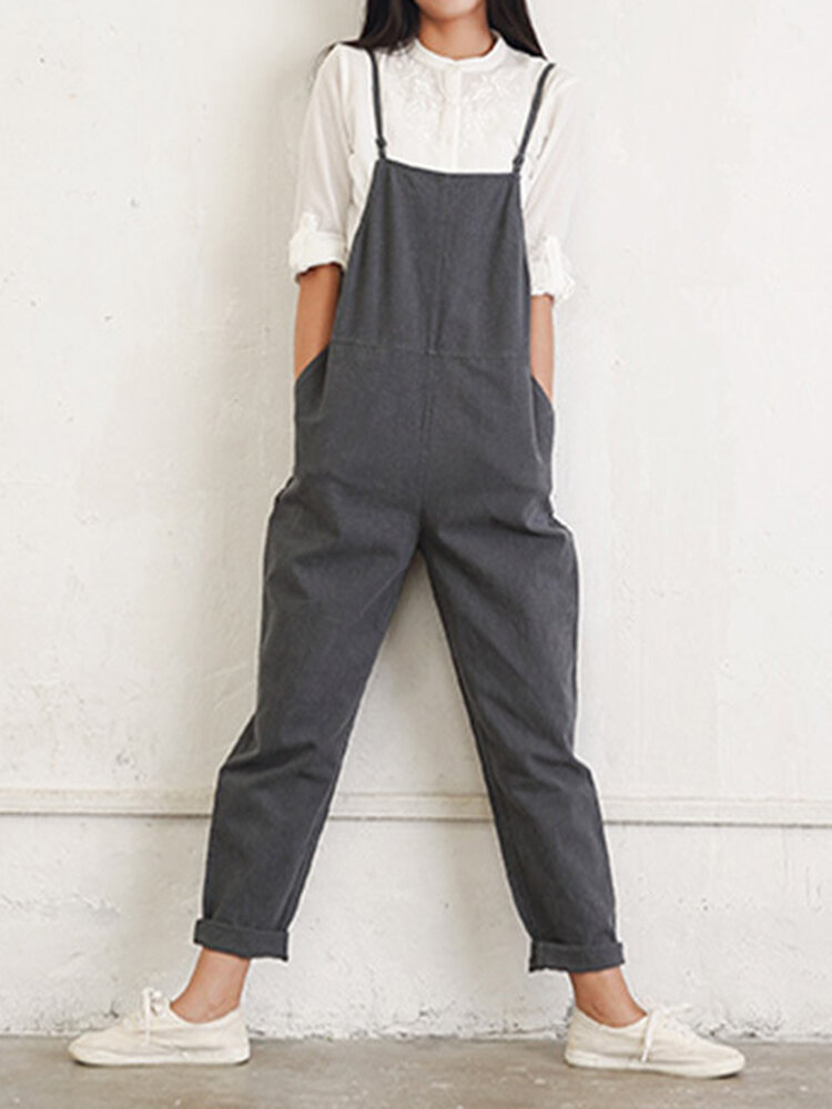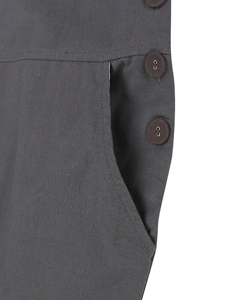 Casual Women Pure Color Side Button Strap Cotton Overalls
