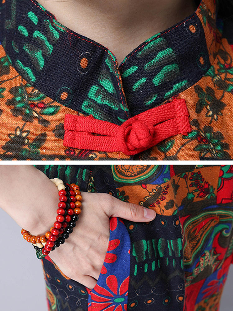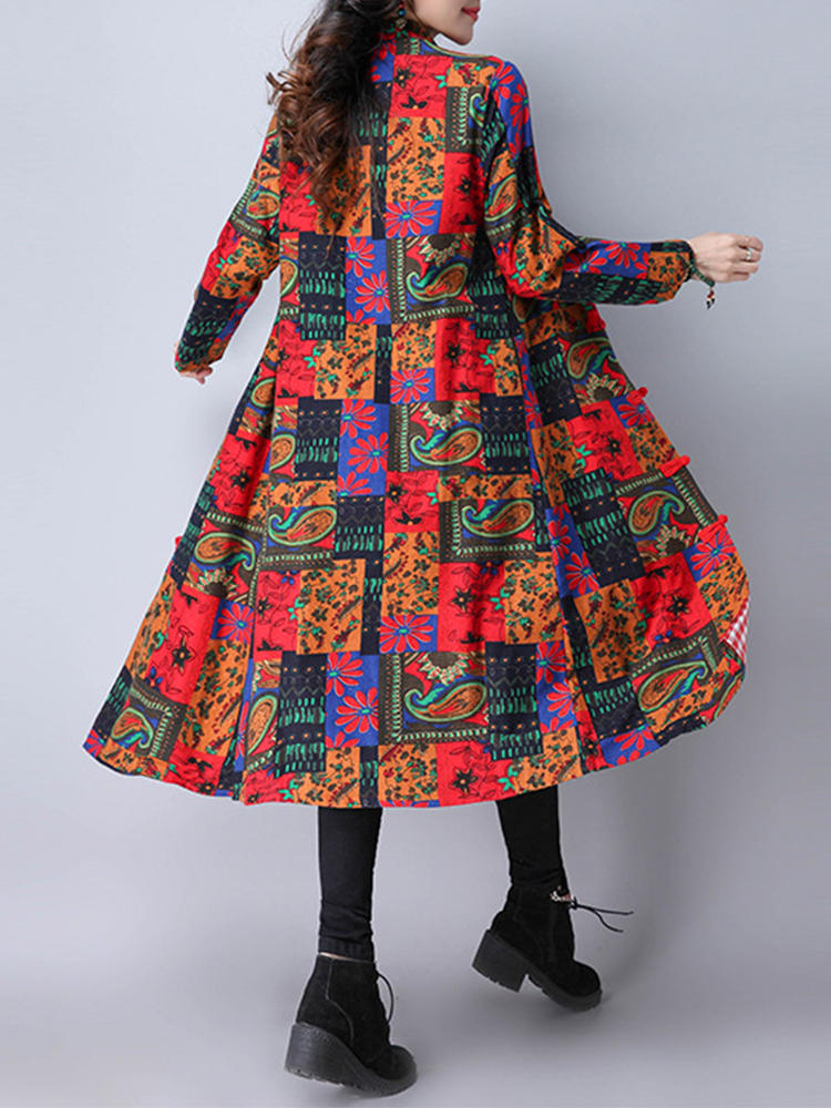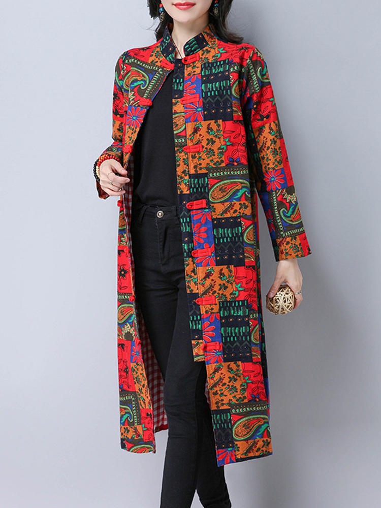• Folk Style Damen Langarm bedruckte Knöpfe Long Coat