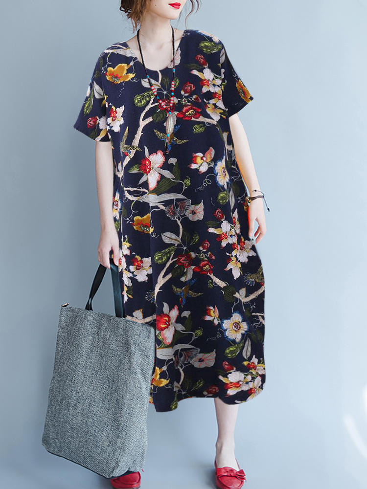 Gracila Women Short Sleeve Floral Loose V-neck Pocket Dresses