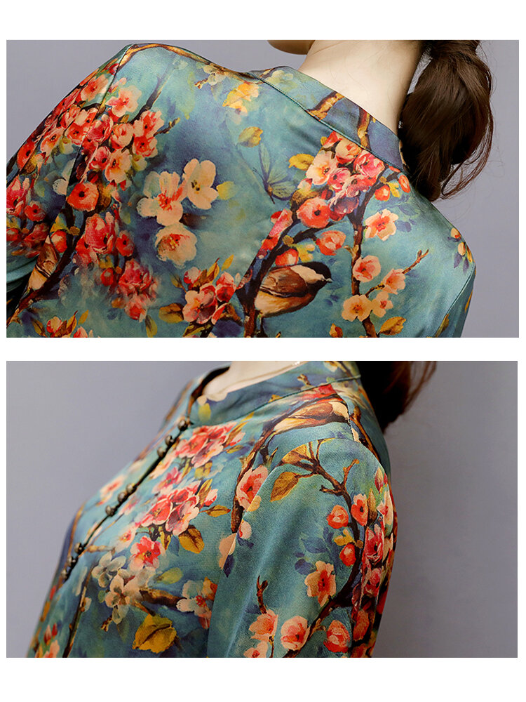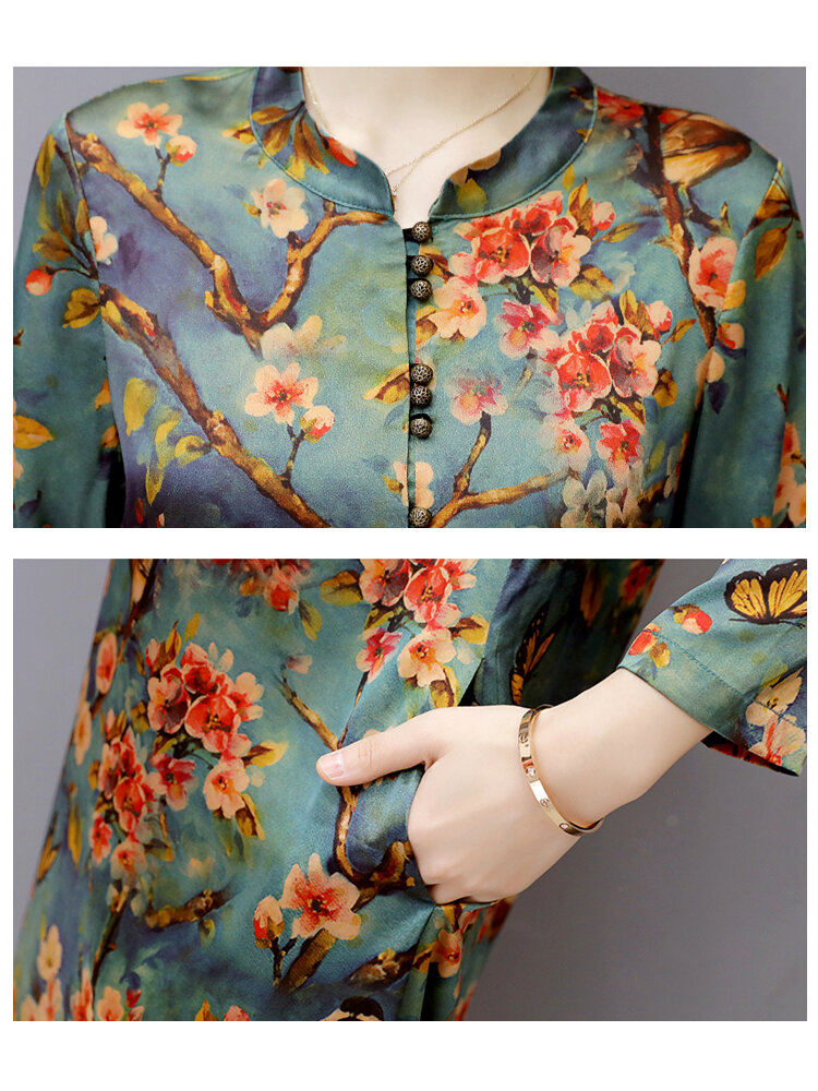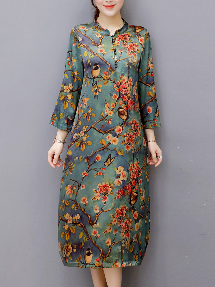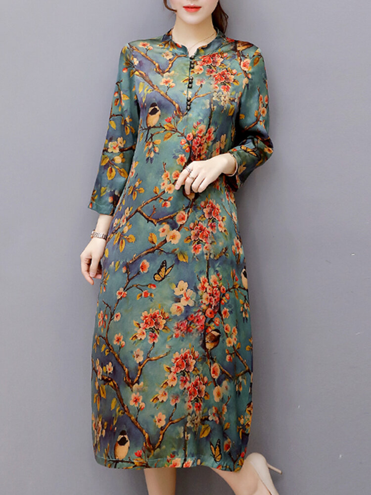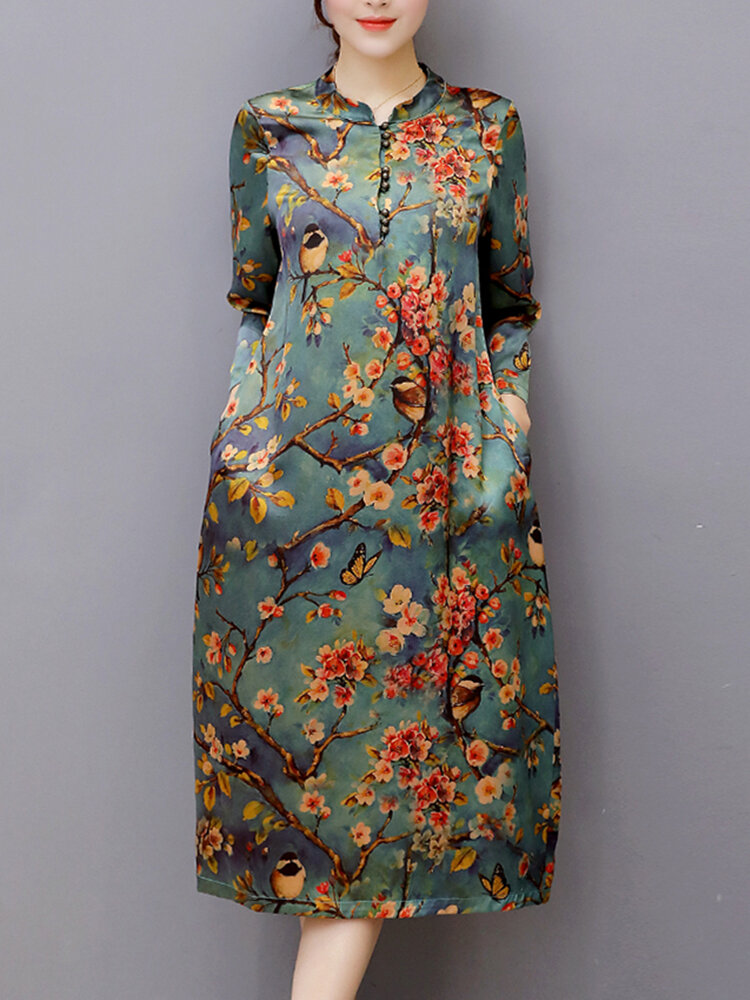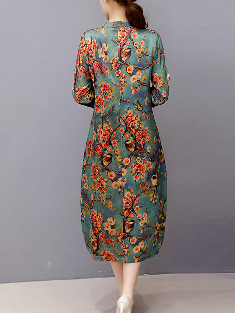 Vintage Damen Blumig bedruckt Langarm Stehkragen Midi Kleid COD