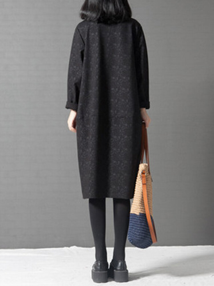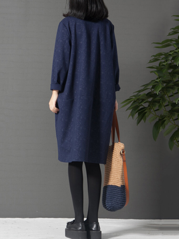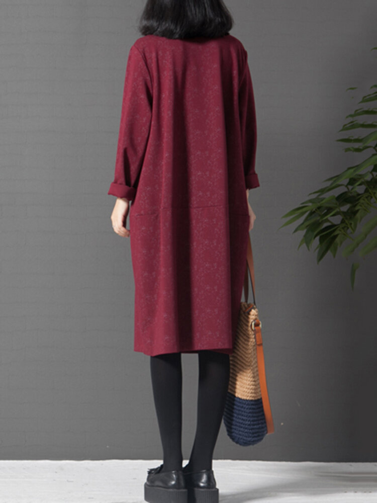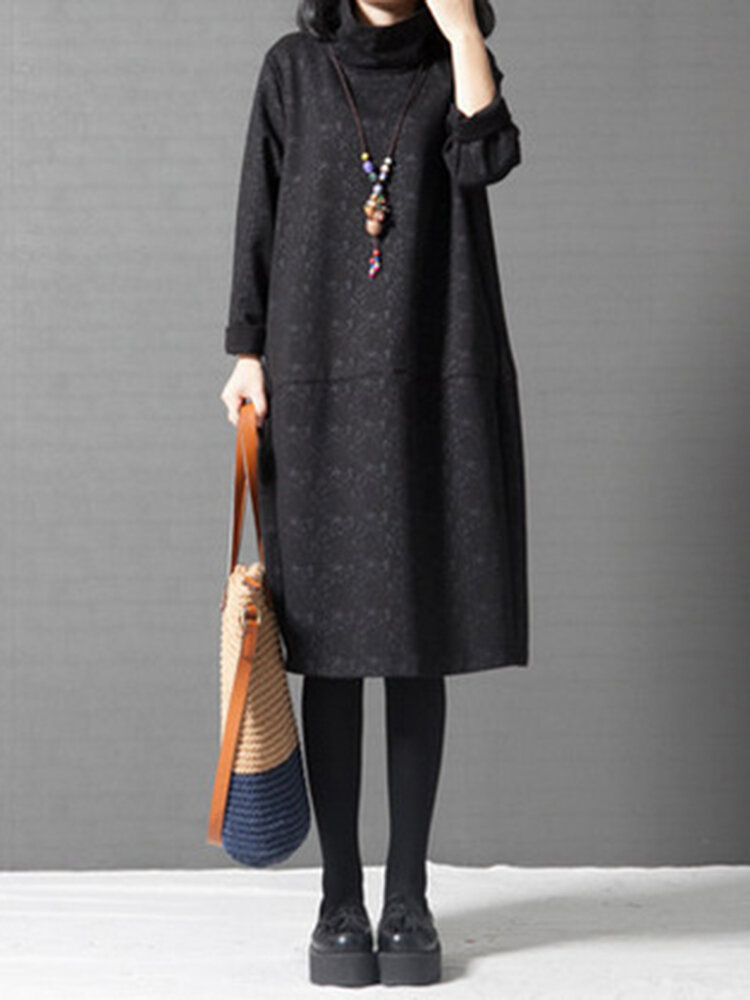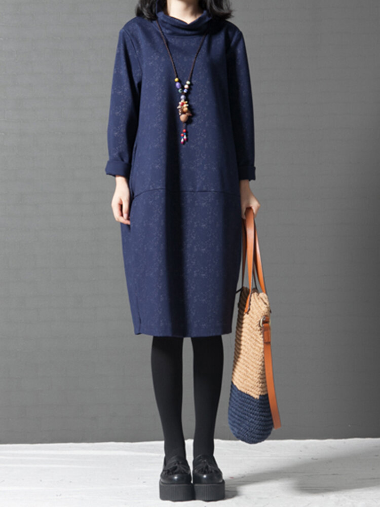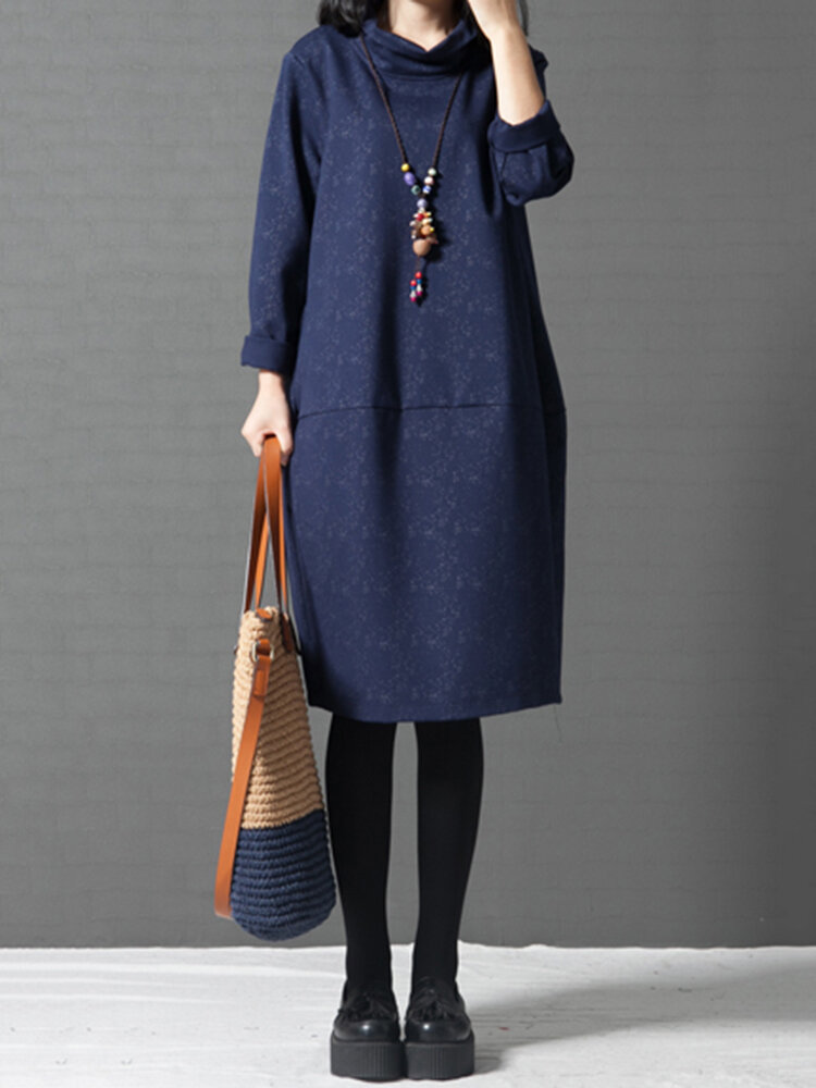 • Vintage Damen Bedruckte Turtleneck Langarm Kleid mit Taschen