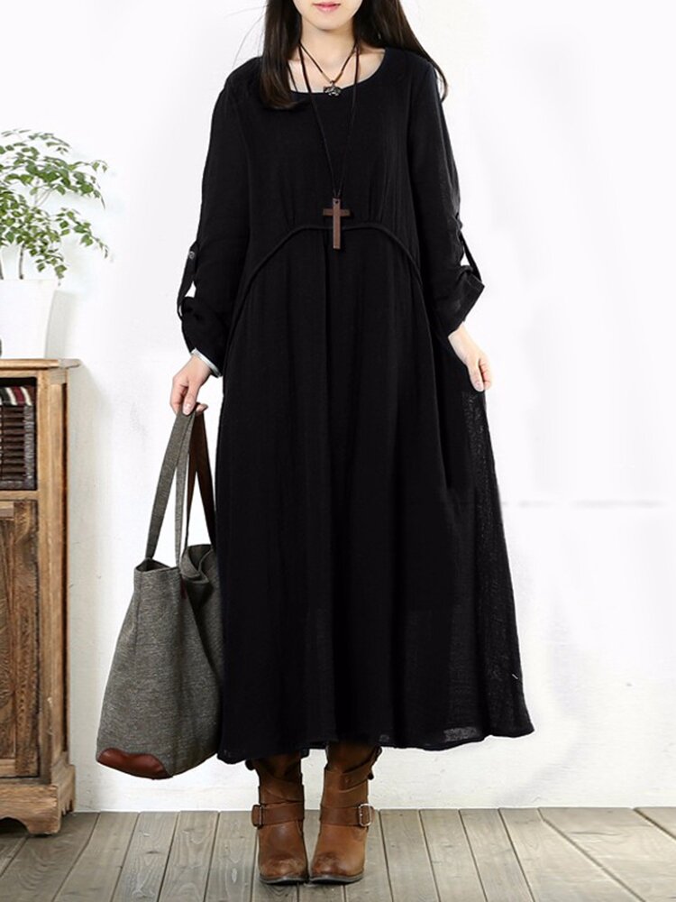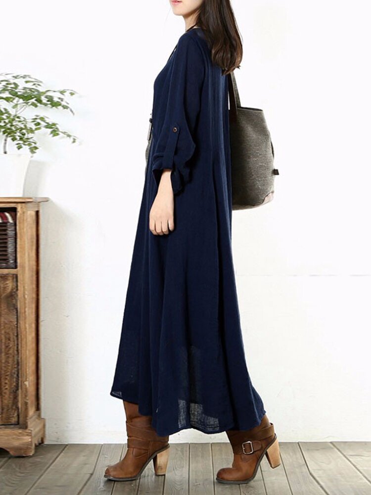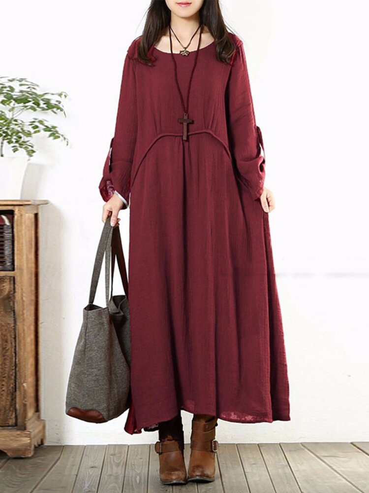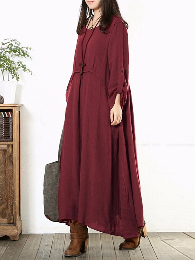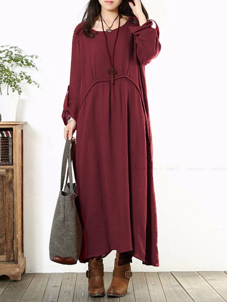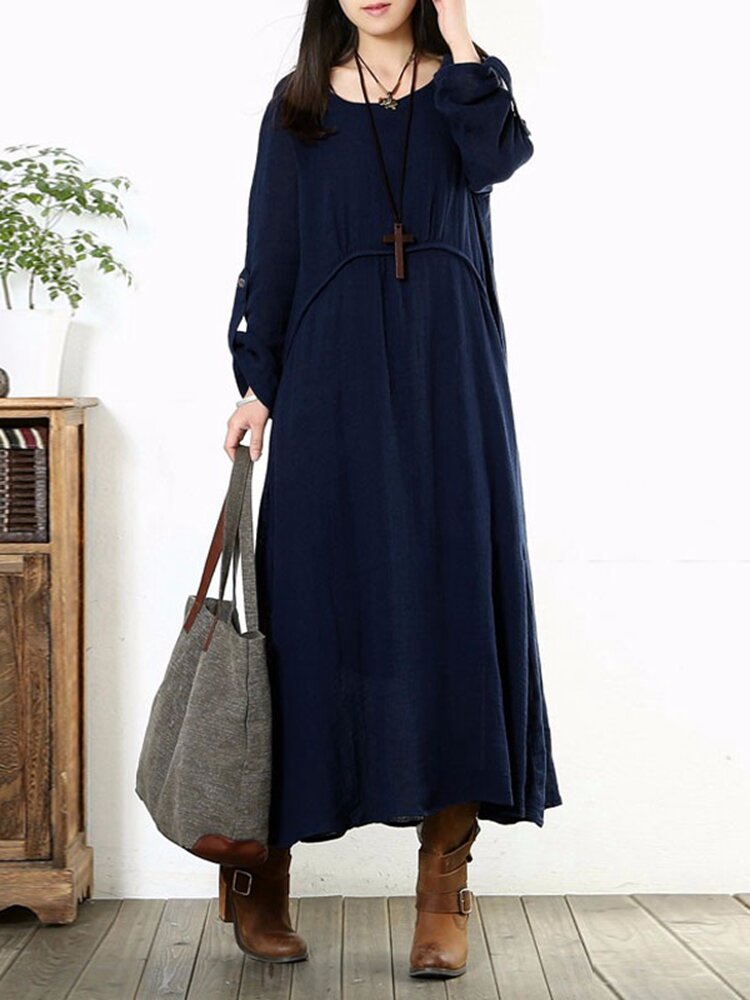 Frauen Lange Hülsen Baumwolle Vintage Solide Farben Rundhals Lockeres Maxikleid