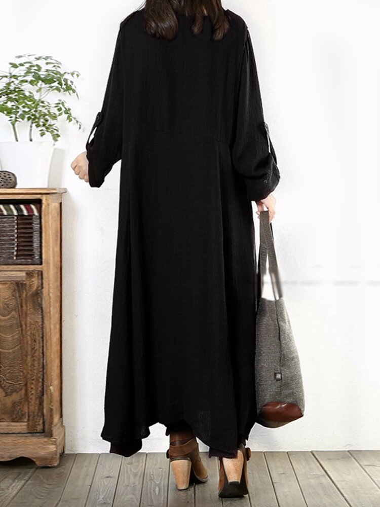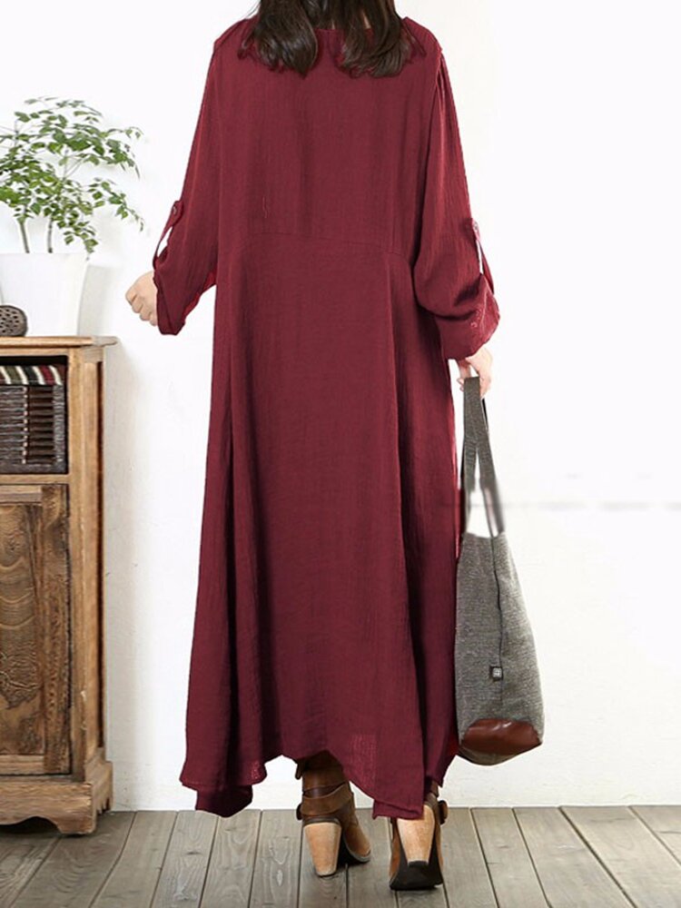 • Frauen Lange Hülsen Baumwolle Vintage Solide Farben Rundhals Lockeres Maxikleid