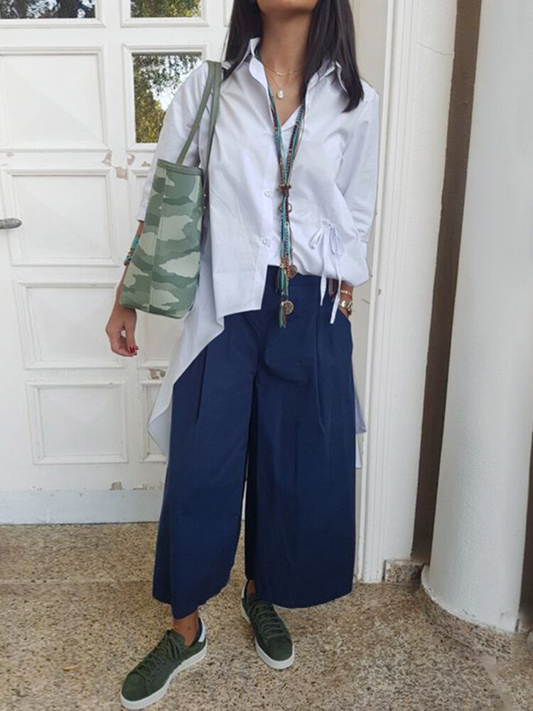 • Frauen Langarm High Low Casual Revers knöpft Hemd Bluse