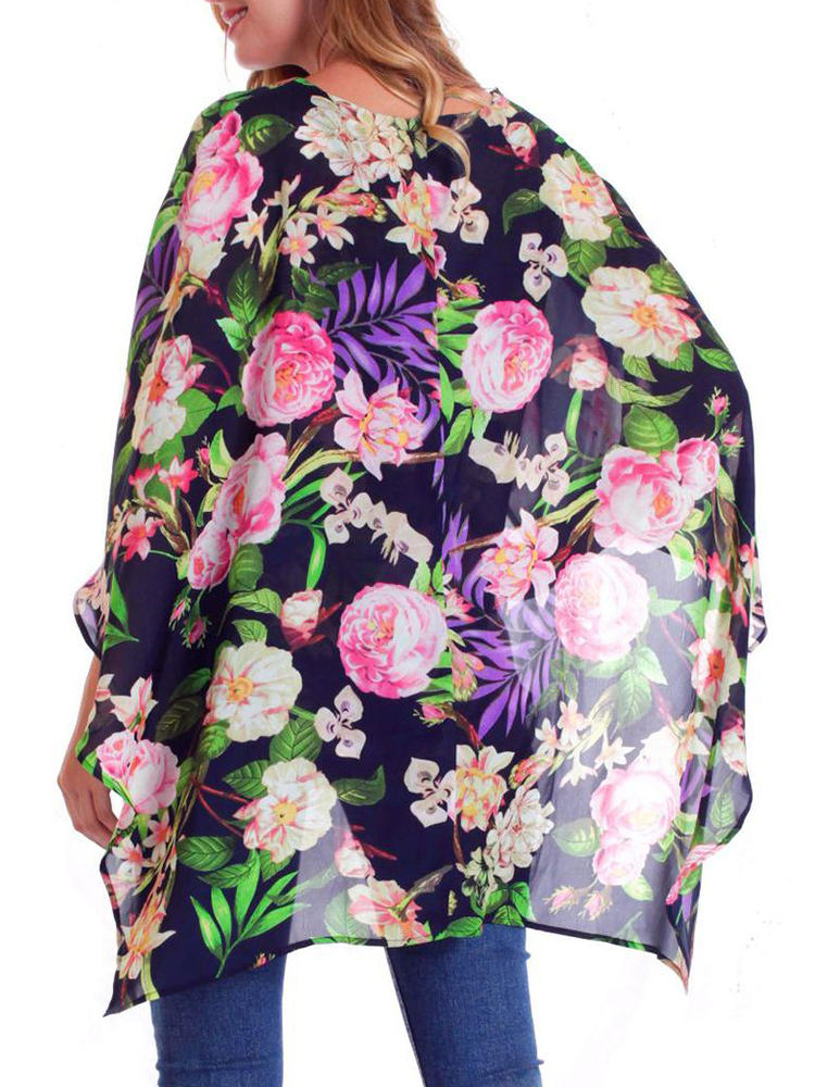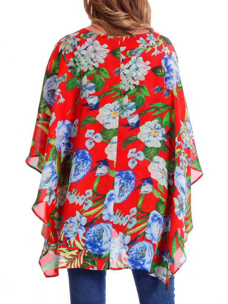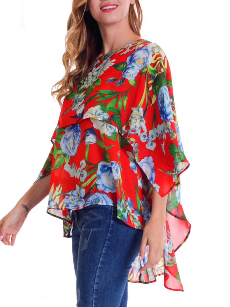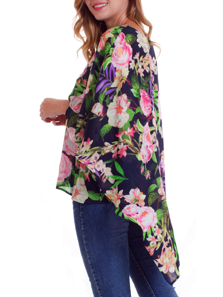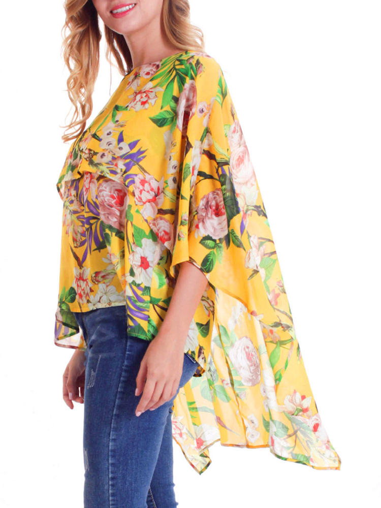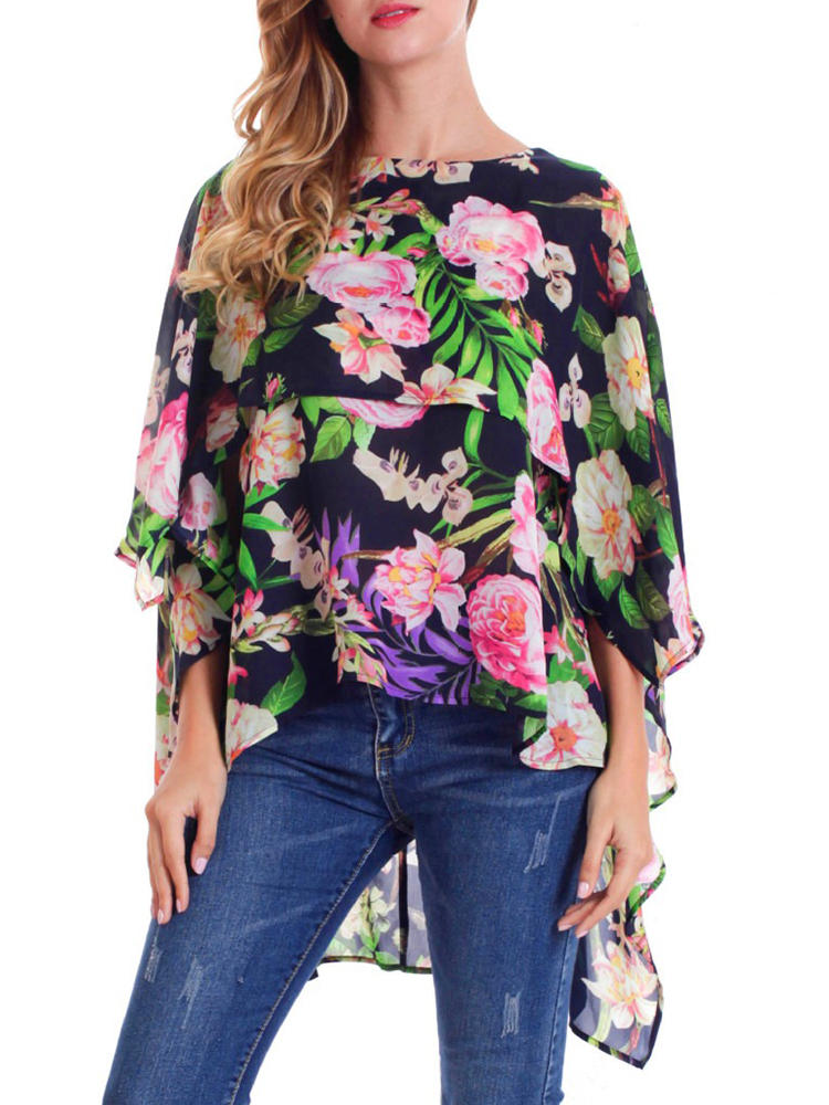 Women O-neck Floral Print Batting Sleeve Irregular Blouse