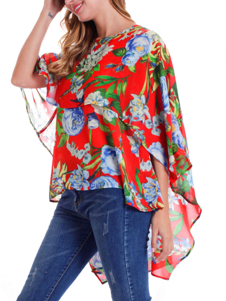 Damen O-Neck Blumendruck Batting Sleeve Unregelmäßige Bluse COD