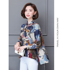 Plus Größe M-5XL Damen Blumendruck Chiffonhemd Lange Ärmel lose Stand Collar Bluse